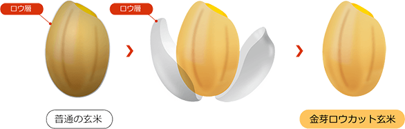 独自技術によって、玄米表面にある硬くて防水性の高い「ロウ層」を均等に除去し、