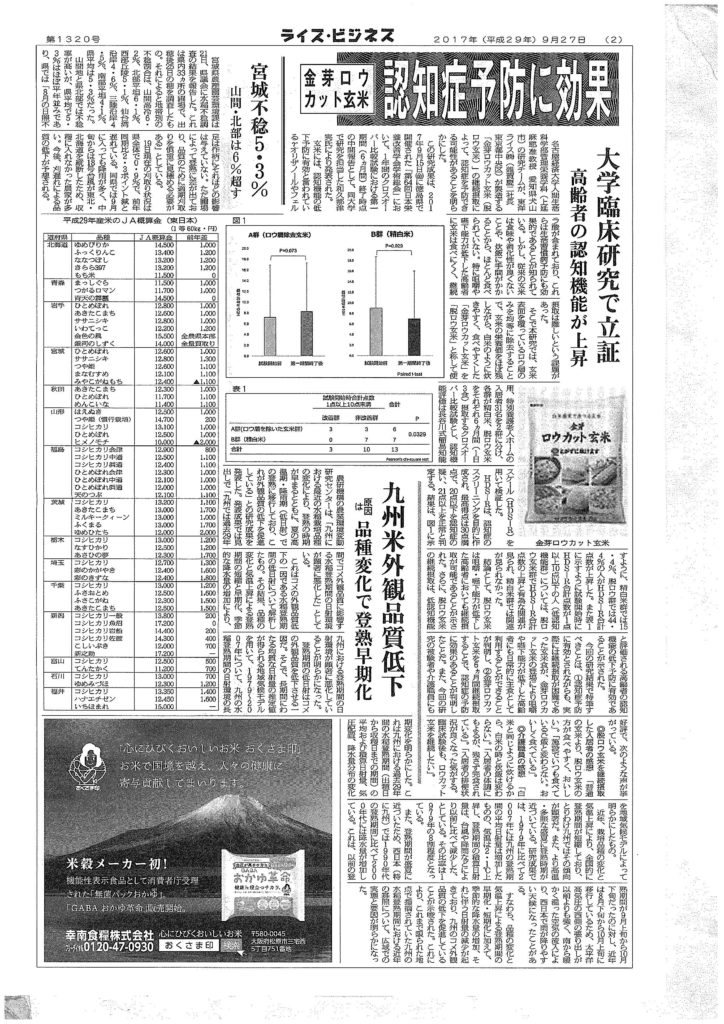 ロウカット玄米の認知症予防への効果に関する研究報告が新聞にも取り上げられました Tweet Share_origin 2017年09月28日 9月28日付けのライスビジネス記事に、ロウカット玄米の認知症予防への効果に関する研究報告の内容が掲載されました。 記事の内容はこちらからご覧いただけます。